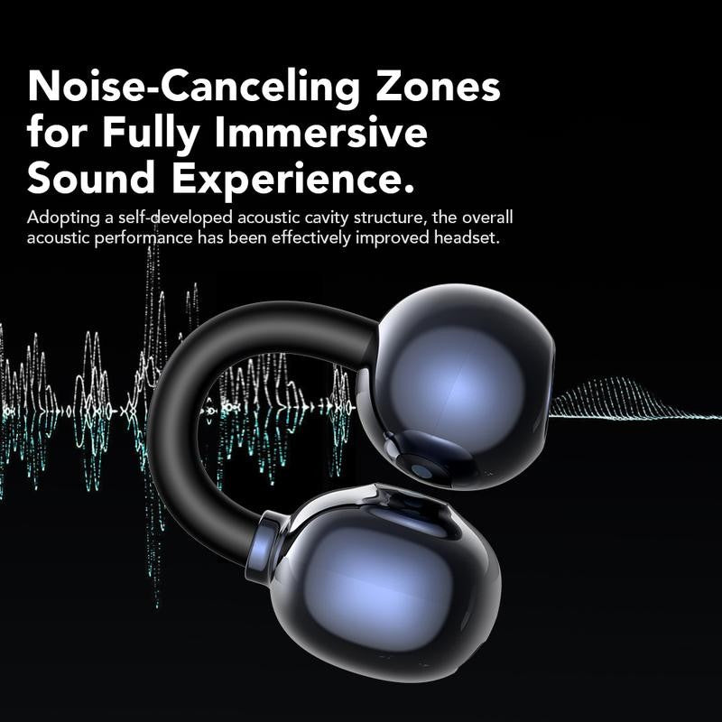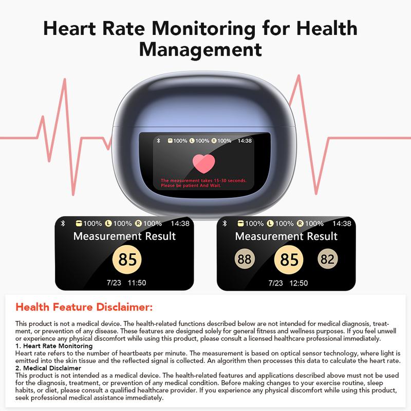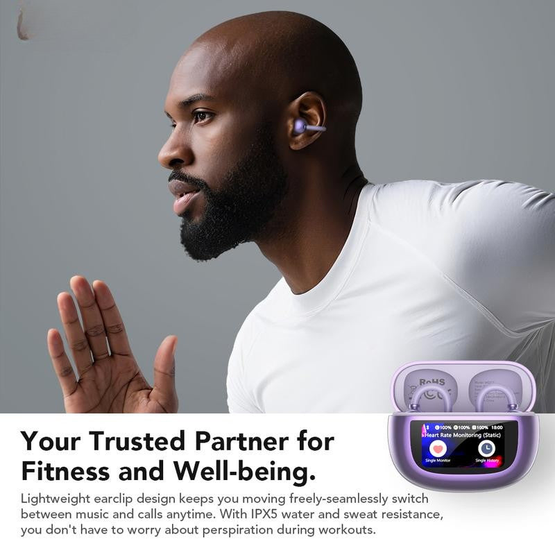 Clip the earbuds onto both ears for heart rate monitoring or audio. Pair via Bluetooth 6.0 for music or calls. Check health stats on the case’s LCD screen.